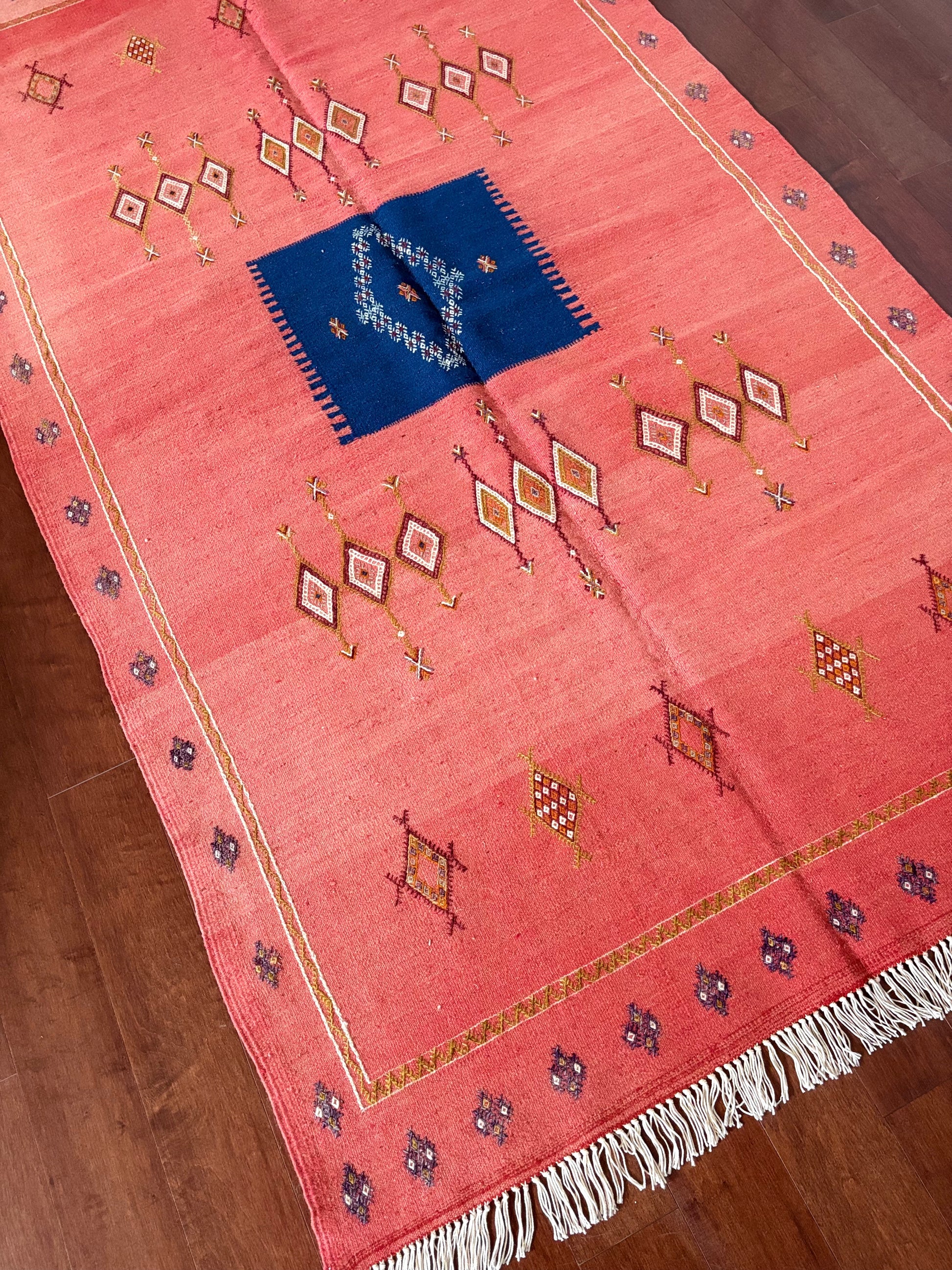 Crafted from 100% natural sheep wool, this rug blends warm antique rose tones with deep indigo accents, creating a soulful piece that feels both grounded and spirited. Rich in history and artistry, it’s a true conversation rug — one that adds character, warmth, and cultural depth to any room.