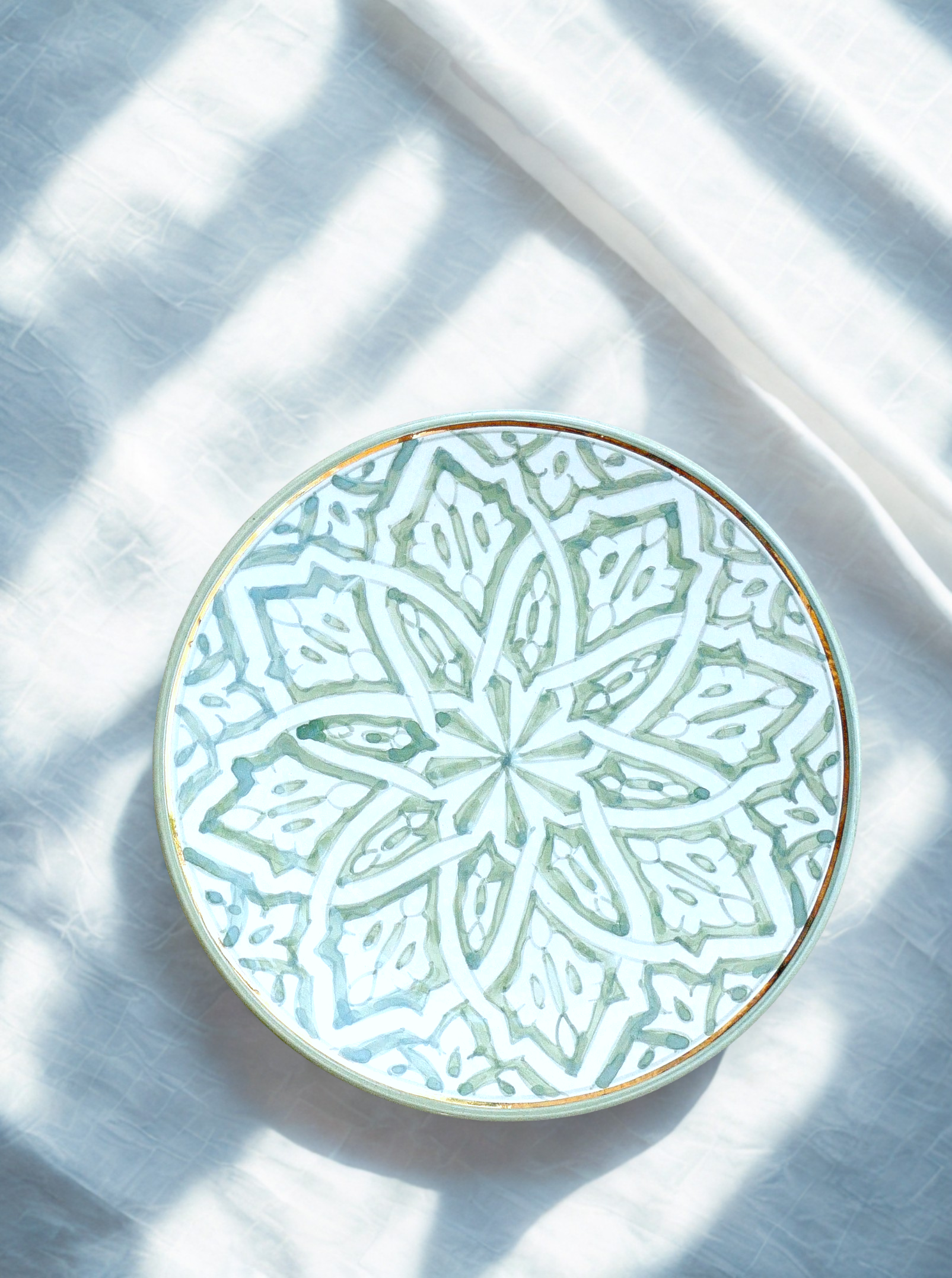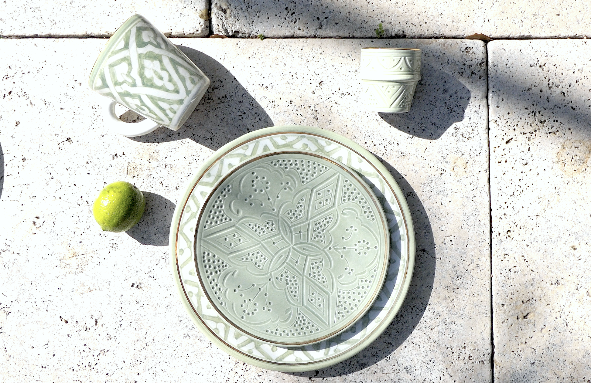 Fresh, modern, and timelessly refined—the Fassia Mint Dinner Plates are designed to elevate every meal. Handcrafted by skilled artisans, each plate features a soft mint glaze accented with delicate 12K gold, blending artisanal character with contemporary elegance. Perfectly sized at 10.23”, they’re ideal for both everyday dining and special gatherings.