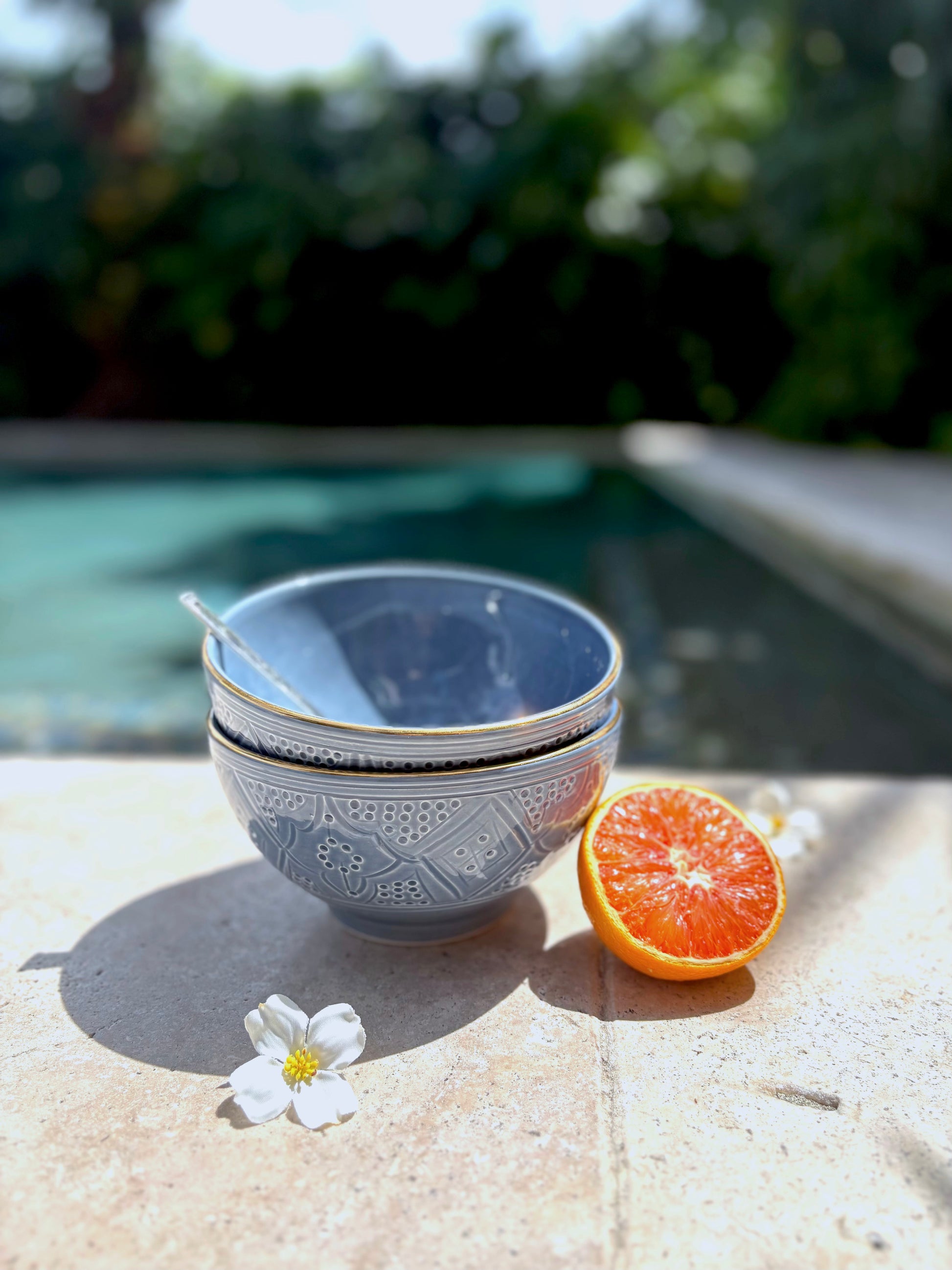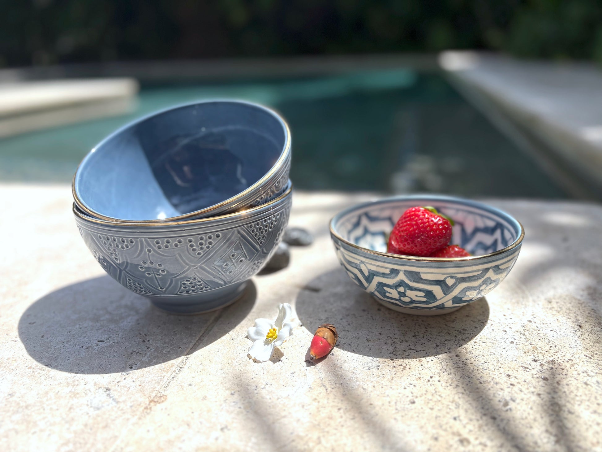 Handcrafted and finished with 12K gold detailing, this 5.9" bowl adds subtle luxury to everyday dining. In a rich Bleu Stone glaze inspired by mineral depths, it balances modern refinement with artisanal soul. Perfect for starters, desserts, or layered tablescapes.