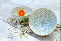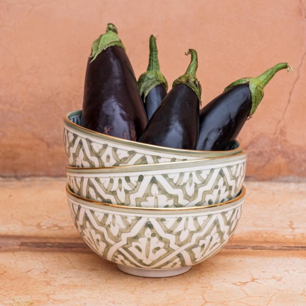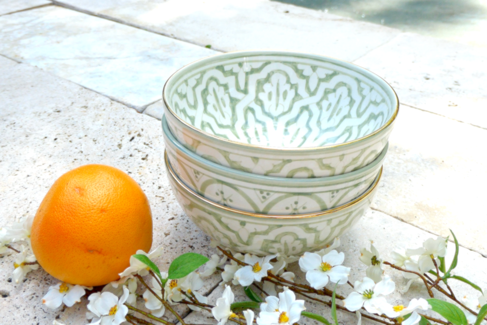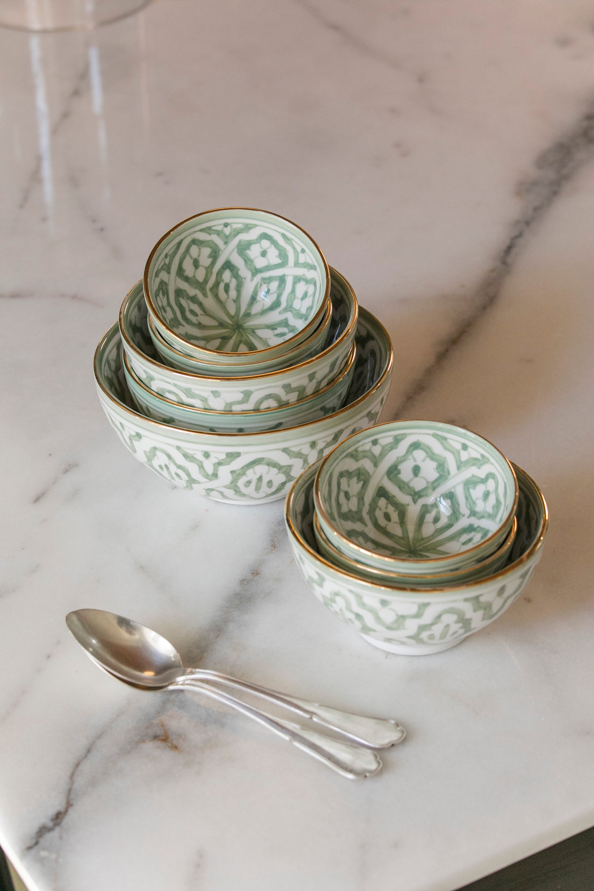 Inspired by traditional patterns from the historic city of Fez, a city renowned for its fine ceramics and zellige. Each bowl features intricate, hand-painted geometric and floral motifs in soft mint green against a warm ivory background.