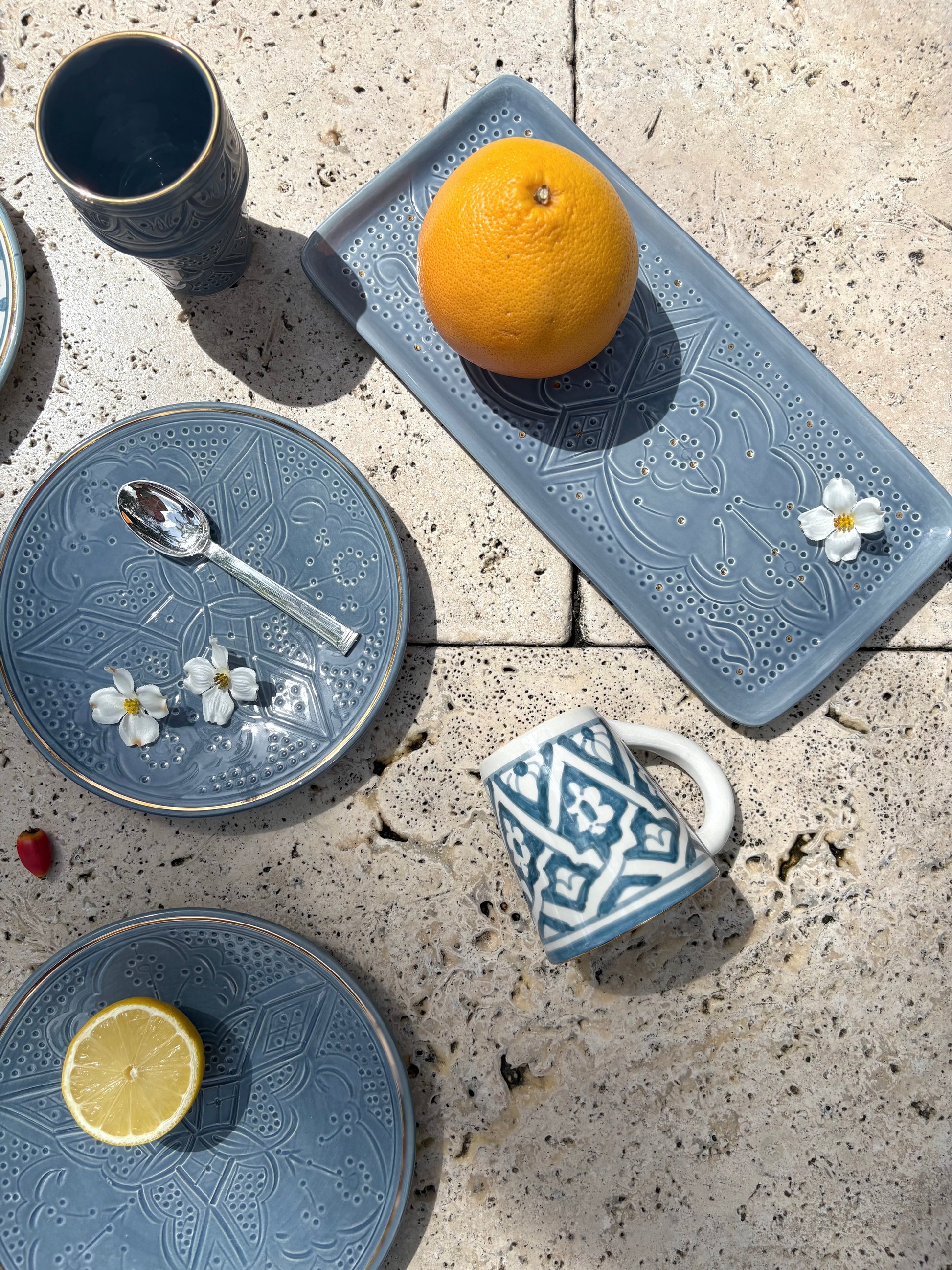 This elongated tray is perfect for serving tapas, desserts, or cheeses, while also doubling as a refined décor piece. Style it with candles or vases on a coffee table or vanity, where its 12-carat gold detailing and artisanal finish add everyday elegance.