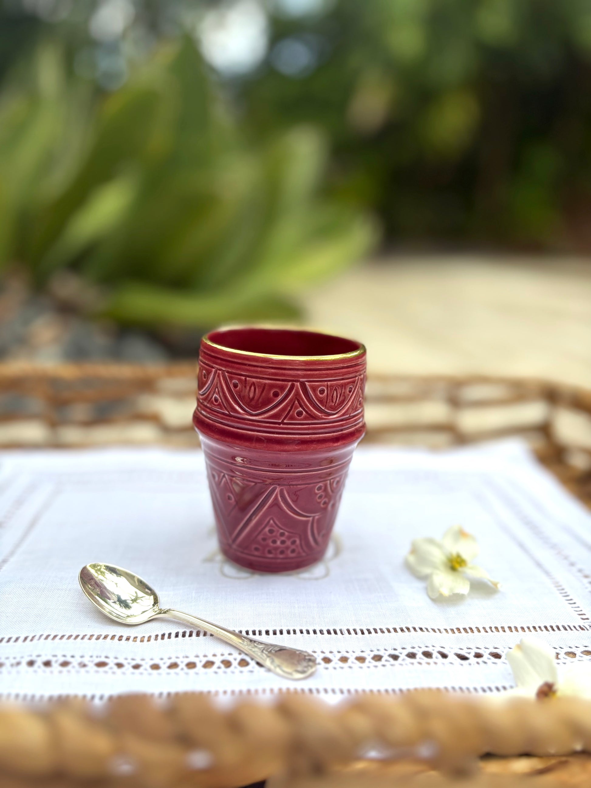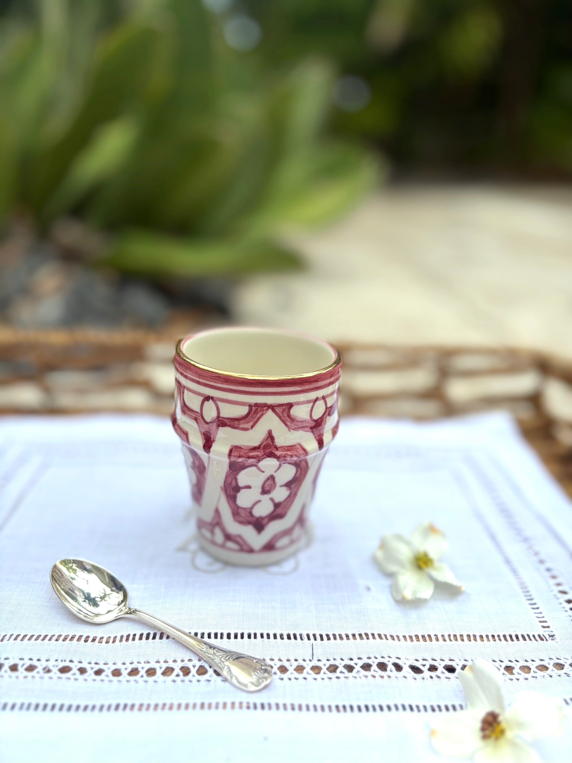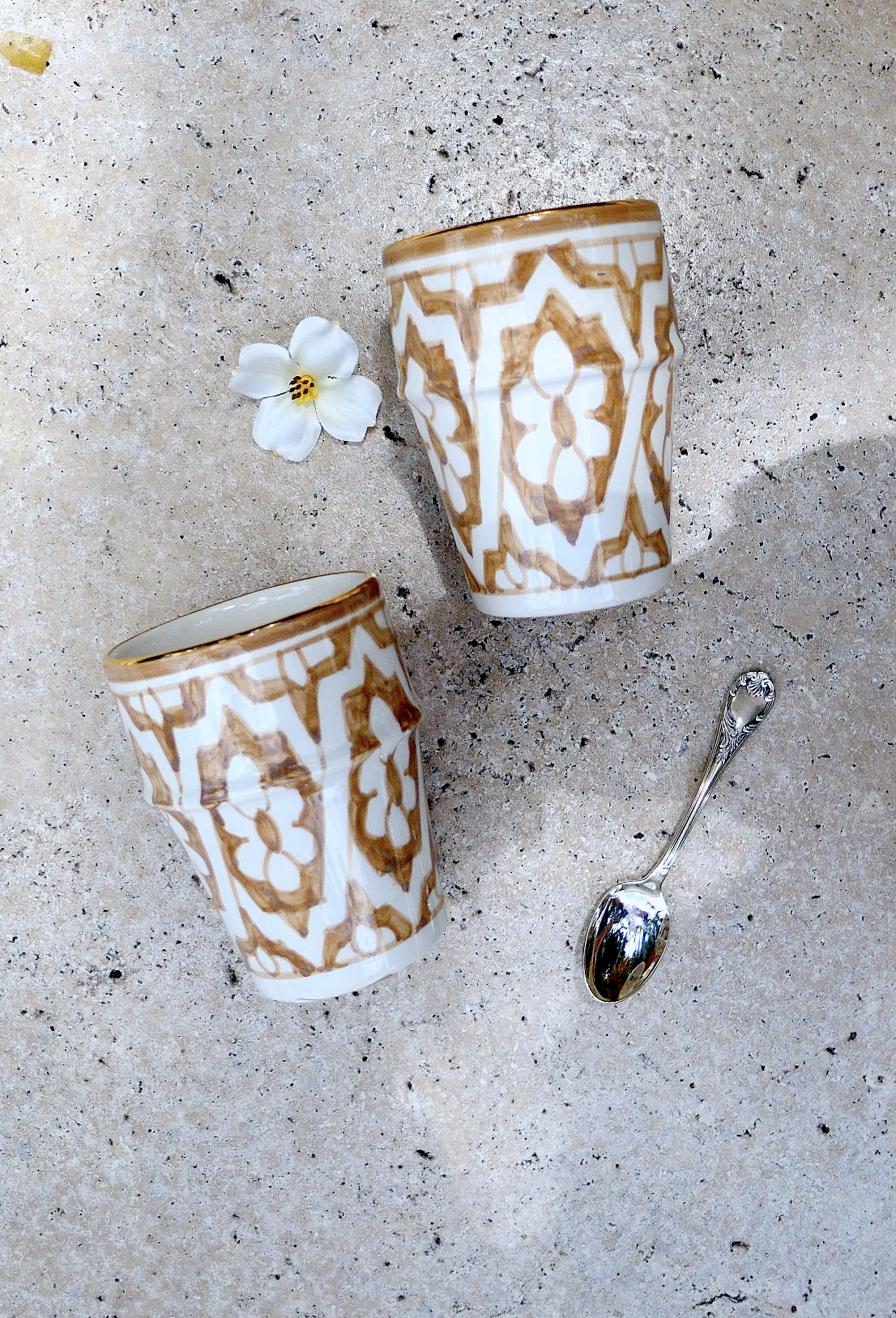 Sized for balance and comfort, our Medium Ceramic Cups are perfect for a strong morning coffee or a calming infusion. Hand-painted by Moroccan artisans and finished with 12K gold, they bring artisanal warmth and everyday elegance to your table. Their size makes them the ideal in-between — more generous than an espresso cup, but lighter than a large serving.