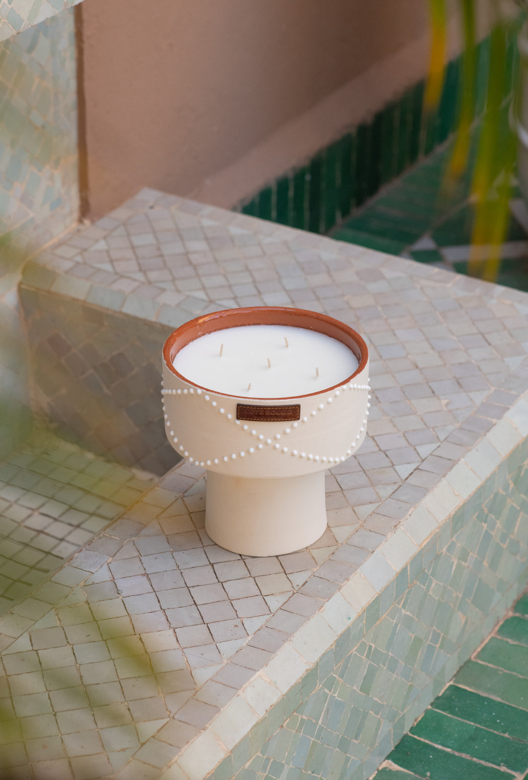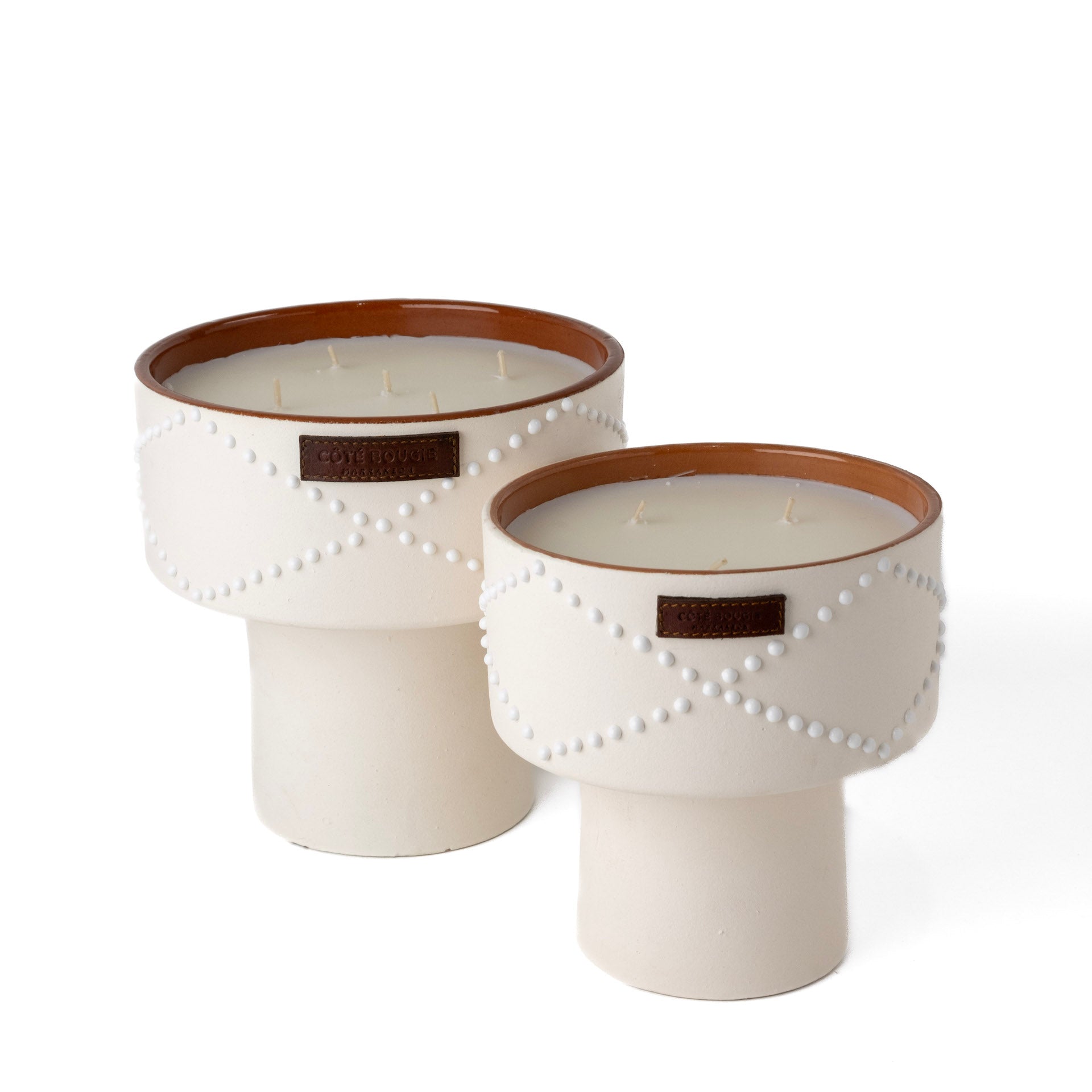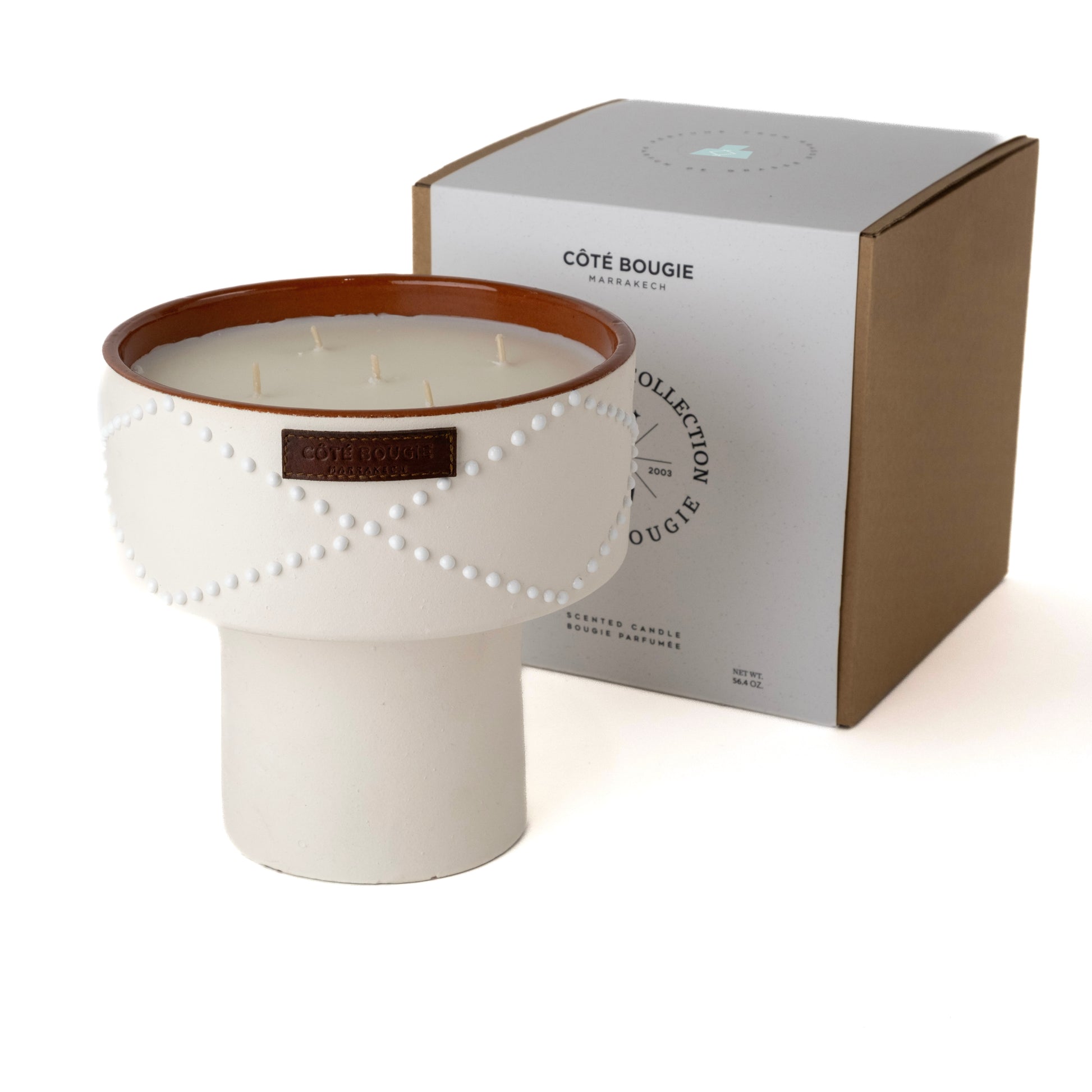 Housed in a handcrafted pearl-gloss ceramic vessel with a sculptural pedestal base, the Nomade Coupe remains a timeless decorative object long after the wax has faded.