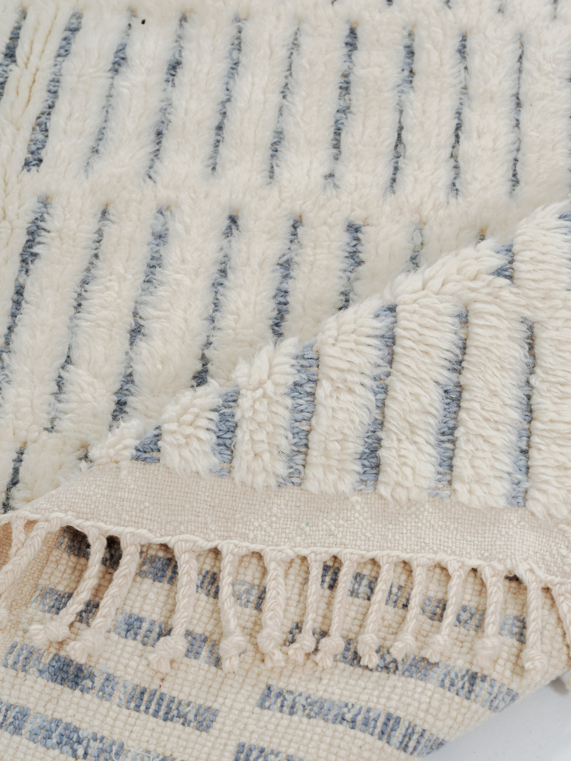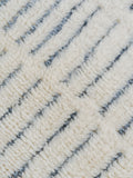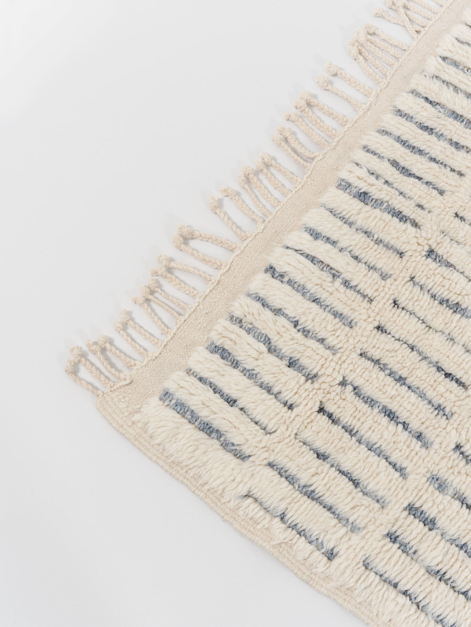 A timeless fusion of heritage and modern design, the Mrirt Rug Nooré is handwoven from 100% natural wool by skilled Berber artisans. Featuring a plush, creamy white base with blue-gray geometric lines, its subtle palette and refined pattern bring both warmth and contemporary elegance to any room.