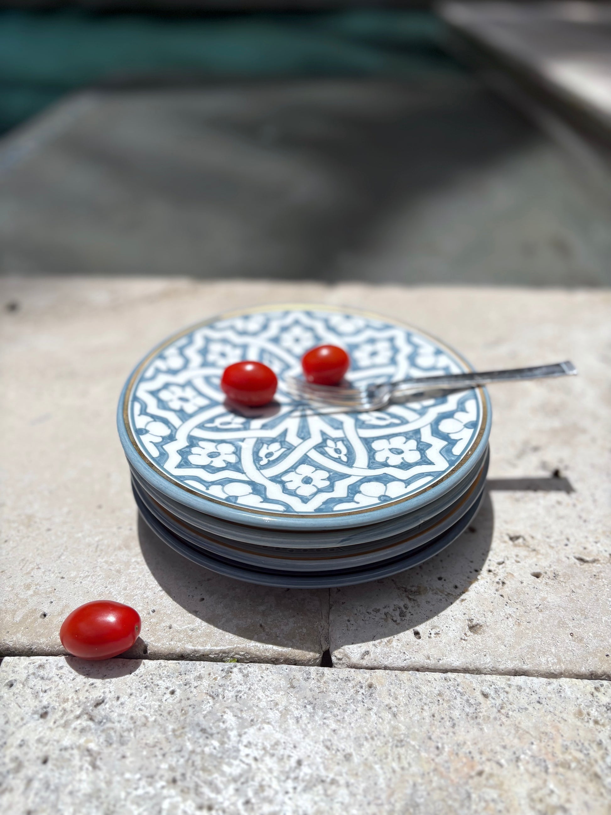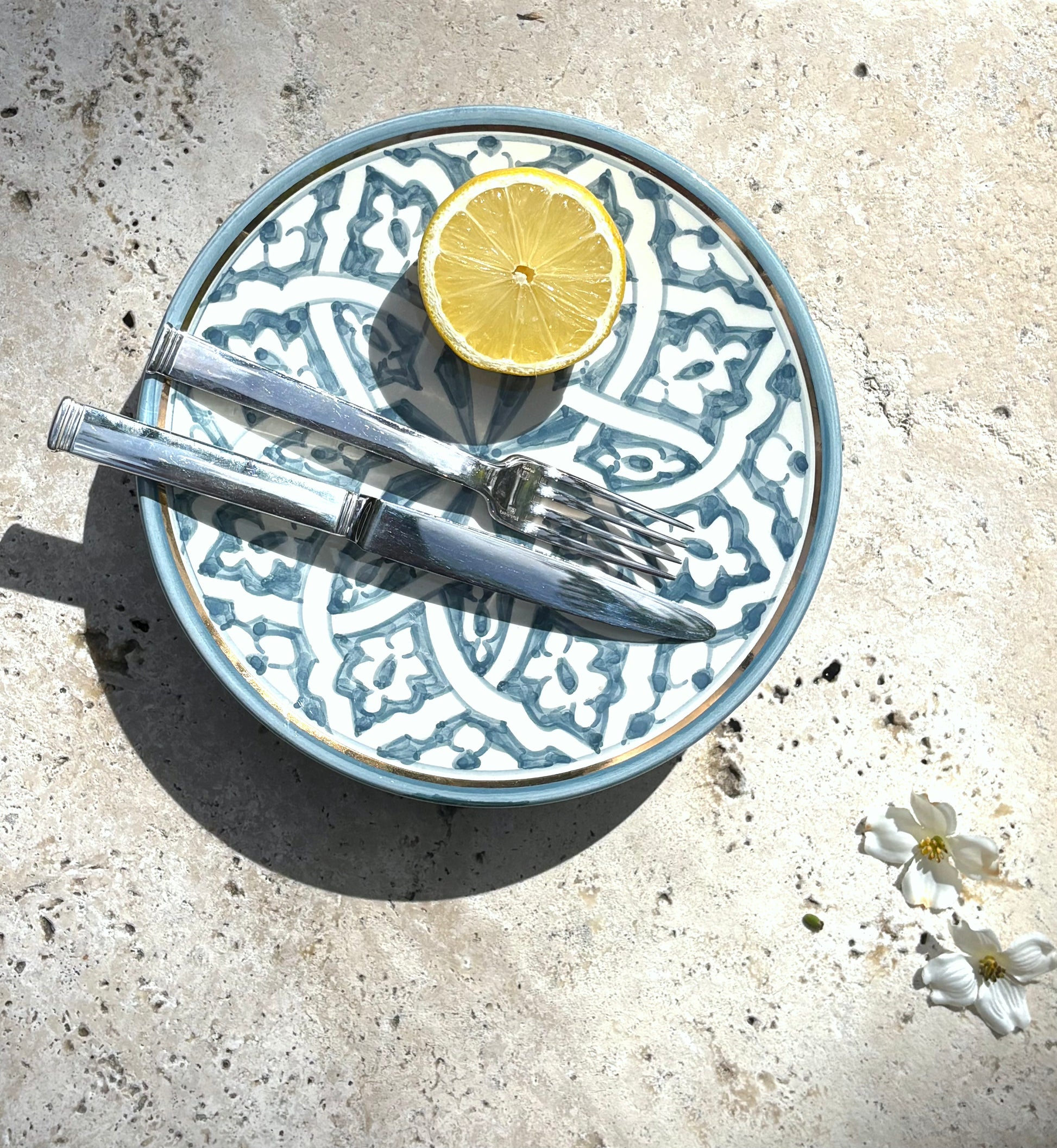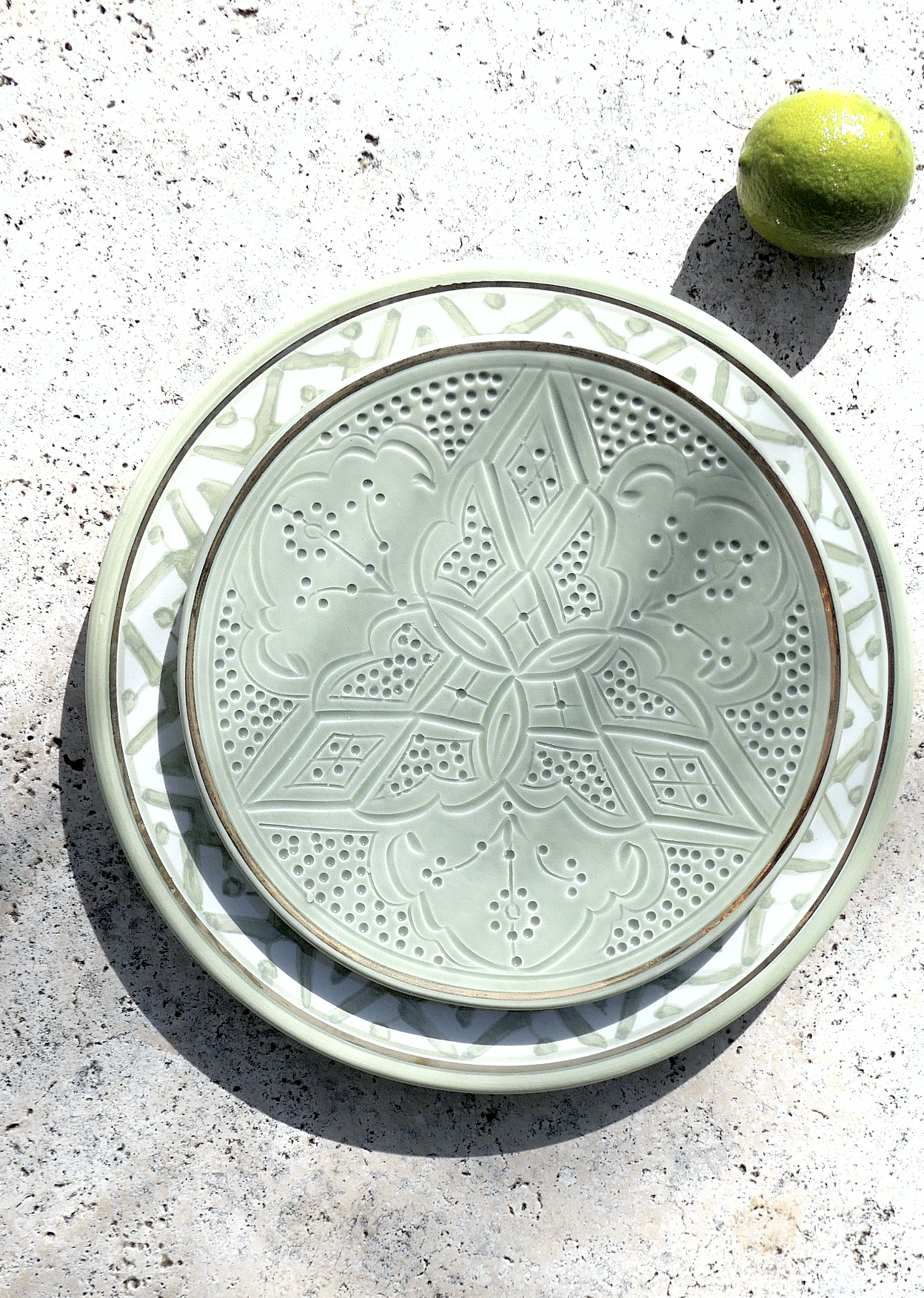 Handcrafted ceramic plates with 12K gold accents.