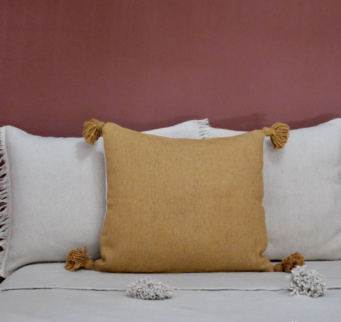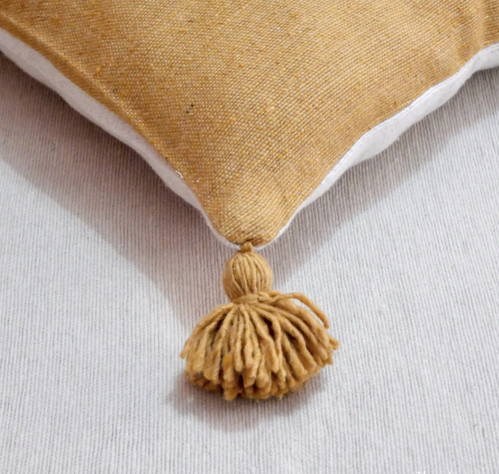 A lively accent in warm saffron, finished with hand-tied wool pompoms for playful sophistication.