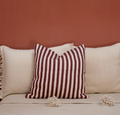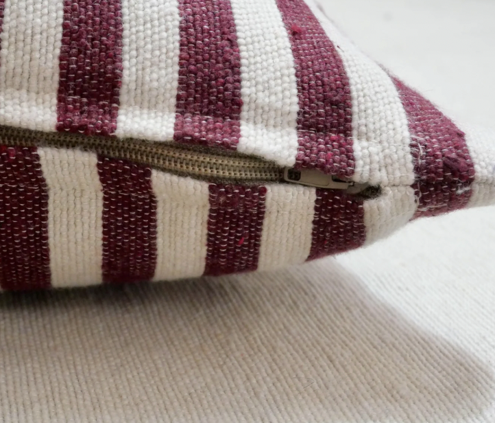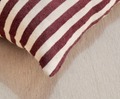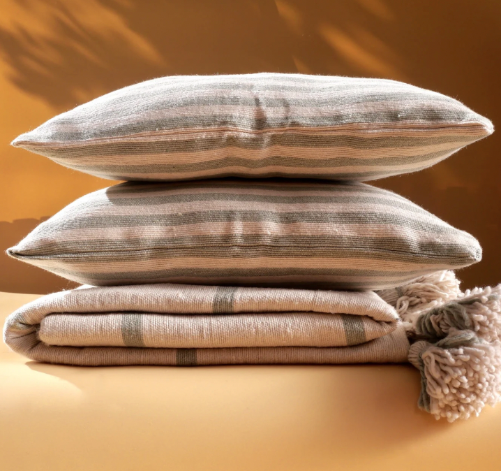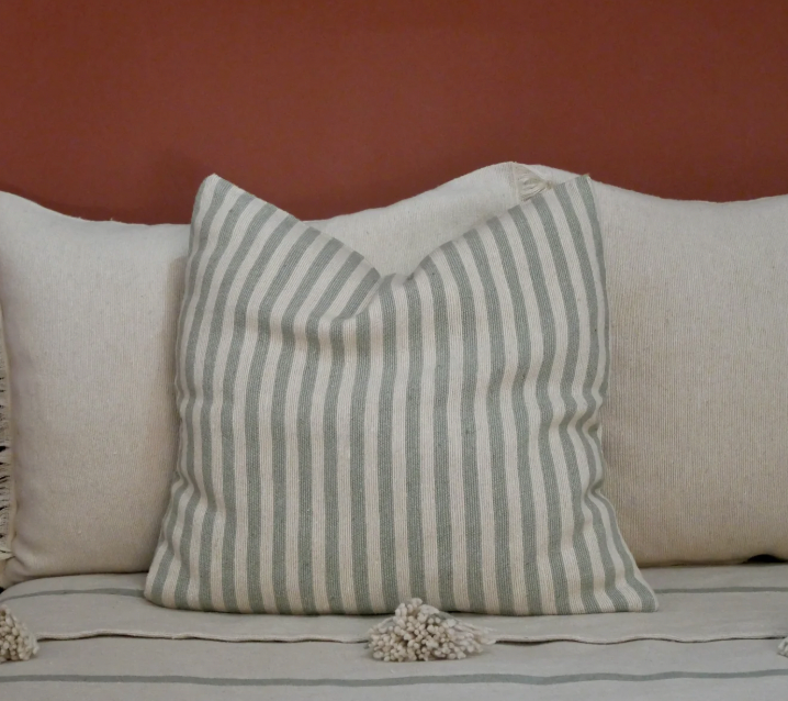Earthy stripes in Sage, Pomegranate, and Safran woven into soft cotton textures. Available in 18x18" and 18x24" for easy layering.